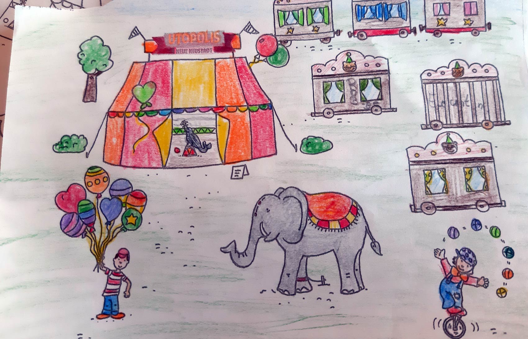 Bei schönstem Wetter beteiligte sich das UTOPOLIS-Projekt mit einem Kreativstand am Spielplatzfest in der Neuen Neustadt, das vom Quartiersmanagment und dem Bürgerverein Neustadt e.V. organisiert wurde. Hier konnten Bilder gemalt, Elefantenmasken gebastelt und eigene Trommeln hergestellt werden. Eine Beteiligung war wichtig, um noch UTOPOLIS bekannt zu machen und den Elefanten als Logo und Maskottchen zu etablieren, mit der Nachbarschaft ins Gespräch zu kommen und Ideen für weitere Projekte und Aktionen zu bekommen.