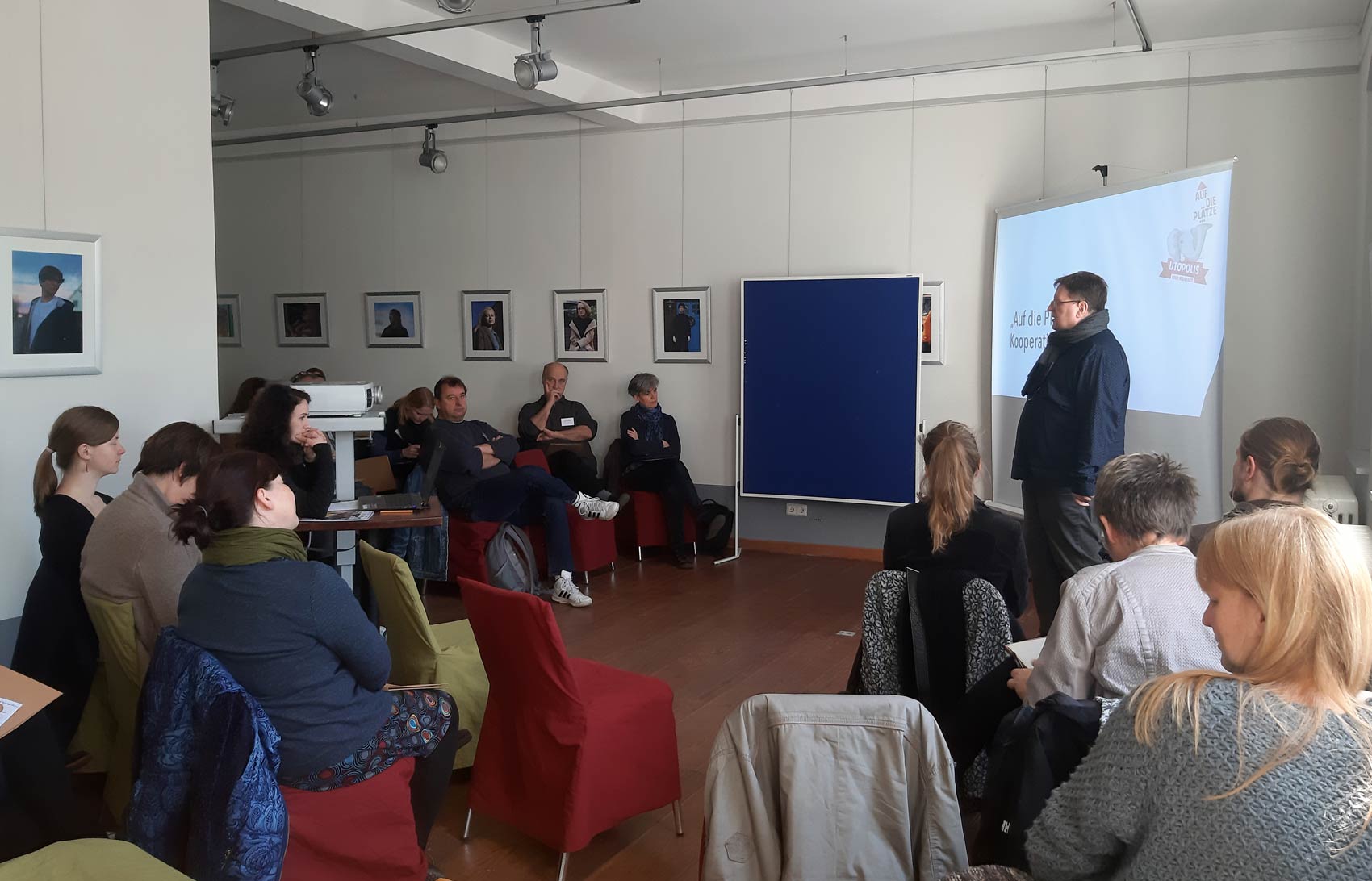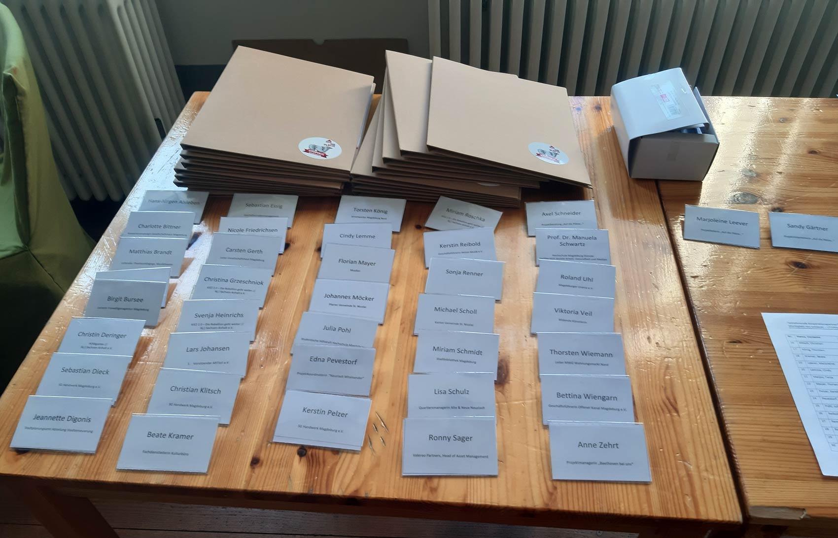 Potentielle Kooperationspartner:innen aus Magdeburg wurden eingeladen, um das Modellprojekt und dessen Ziele vorzustellen. In einer kleinen Workshopphase wurden Ideen für die mittel- und langfristige Zusammenarbeit gesammelt. Dabei wurden die Querschnittsaufgaben wie Nachhaltigkeit, Inklusion, Kinder-, Jugend- und Seniorenarbeit mithilfe von Kunst und Kulturarbeit in den Fokus gesetzt. Die Fragestellungen waren: Welche Erfahrungen haben Sie dabei in Ihrer Arbeit mit verschiedenen Zielgruppen gemacht? Welche partizipativen Formen kultureller Bildung sehen Sie in Ihrem Bereich? Und: Welche Möglichkeiten der Zusammenarbeit sehen Sie in diesem Projekt?